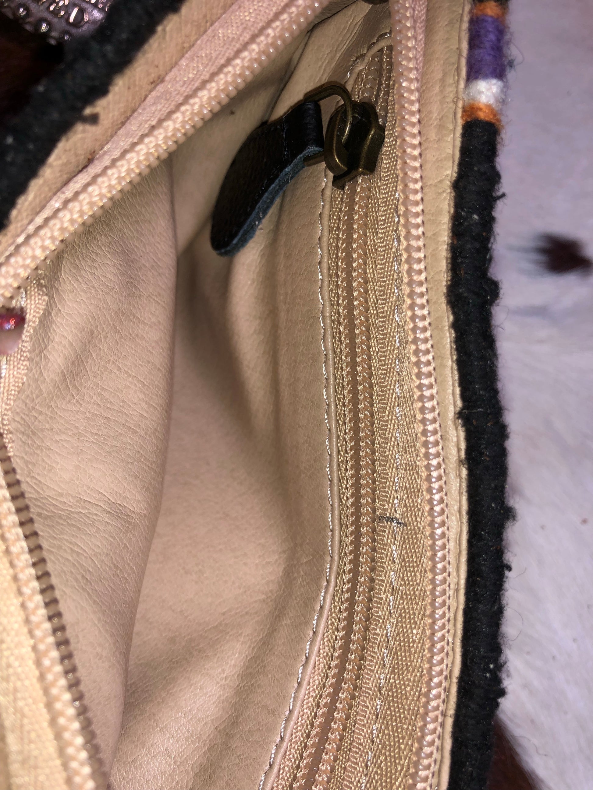 Perfect for Game Day! Stadium size approved. Fully lined with an inside zipper privacy pocket. Included on the zipper as our trademark is a small vintage laundry pin. Hand made leather wristlet strap and 12" of fringe.