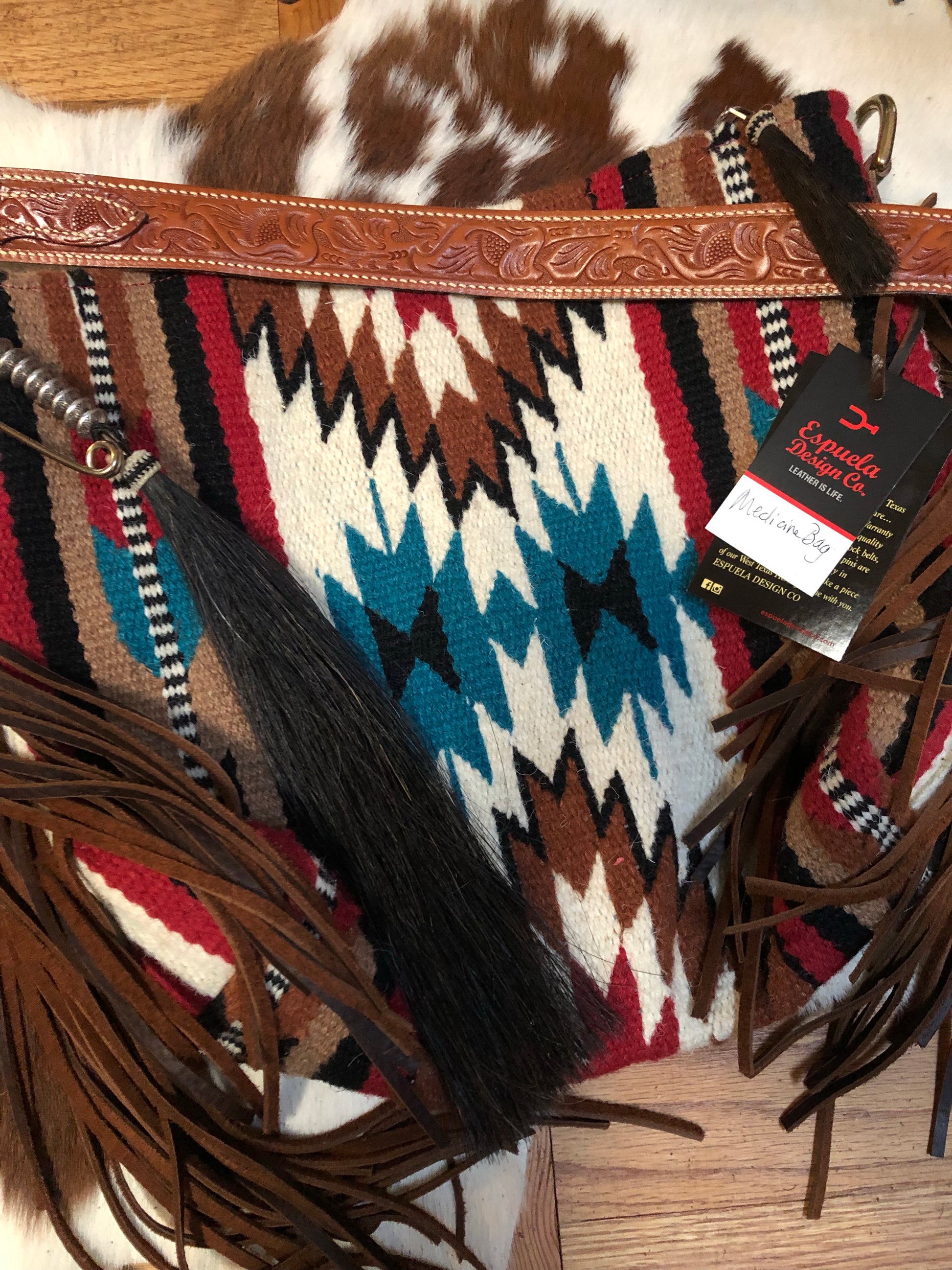 Hand Crafted,100% Wool, Medicine Bag Saddle Blanket is fully lined with two large inside pockets and zipper closure. Vintage 1970’s belt, Tack Quality D-Rings, Unique Western Concho and Belt Strap, Hand Fringed down Both Sides with Cut Latigo Leather Fringe, Antique Laundry Pin, Spirit Beads, 10” horsehair shoo-fly, Horse Hair Zipper Pull.