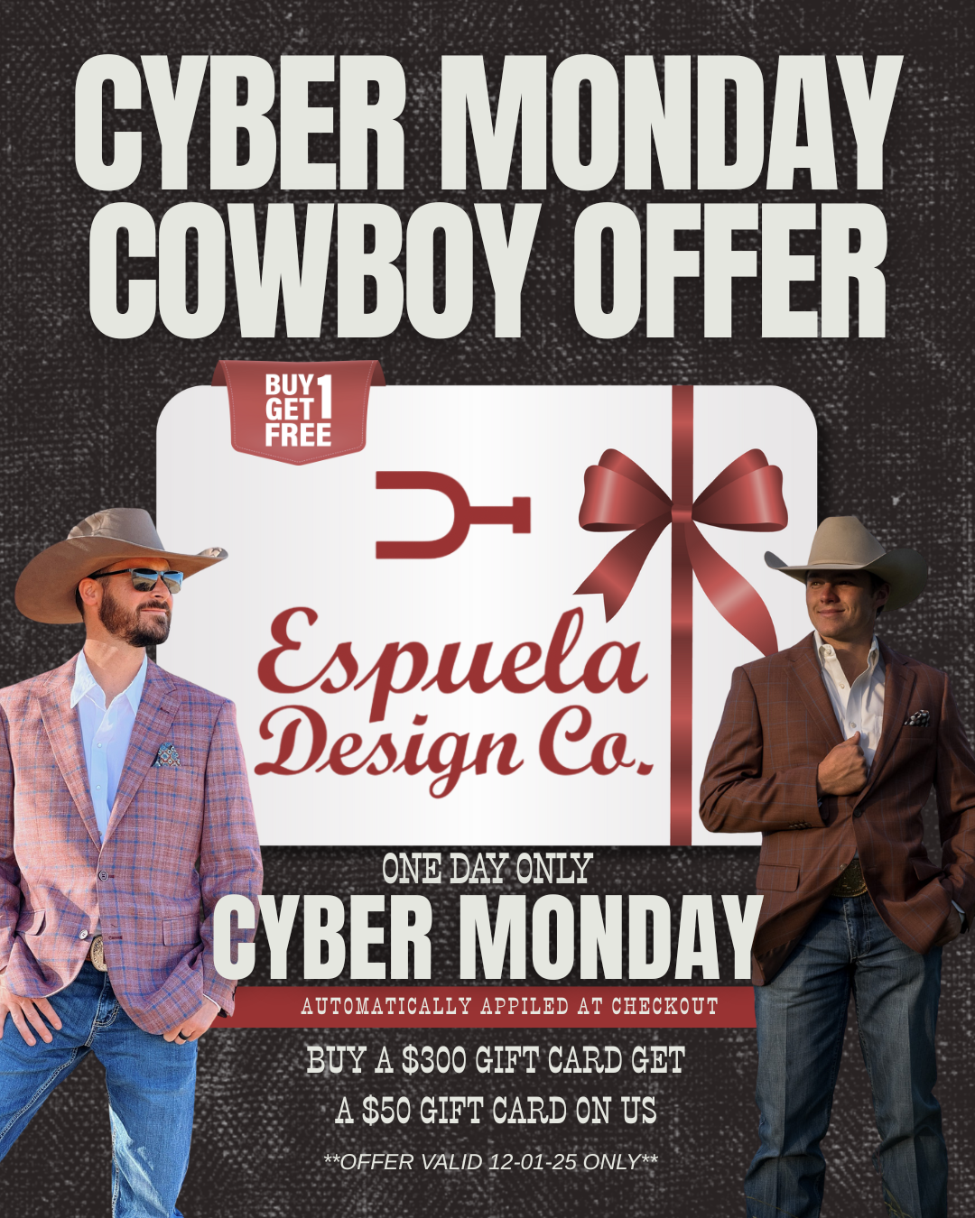 Our Cyber Monday Western wear deal gives shoppers a free fifty dollar gift card when purchasing a three hundred dollar Espuela Design Co. gift card. This one-day online offer is perfect for holiday gifting and for anyone shopping for cowboy sport coats, Western fashion and premium men’s apparel. Gift cards can be used toward any handcrafted sport coat for the season ahead. Don’t miss one of the best Cyber Monday deals in Western wear.